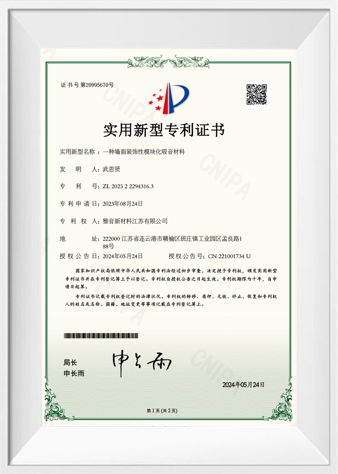 Certificato di brevetto per materiale fonoassorbente modulare per decorazione murale